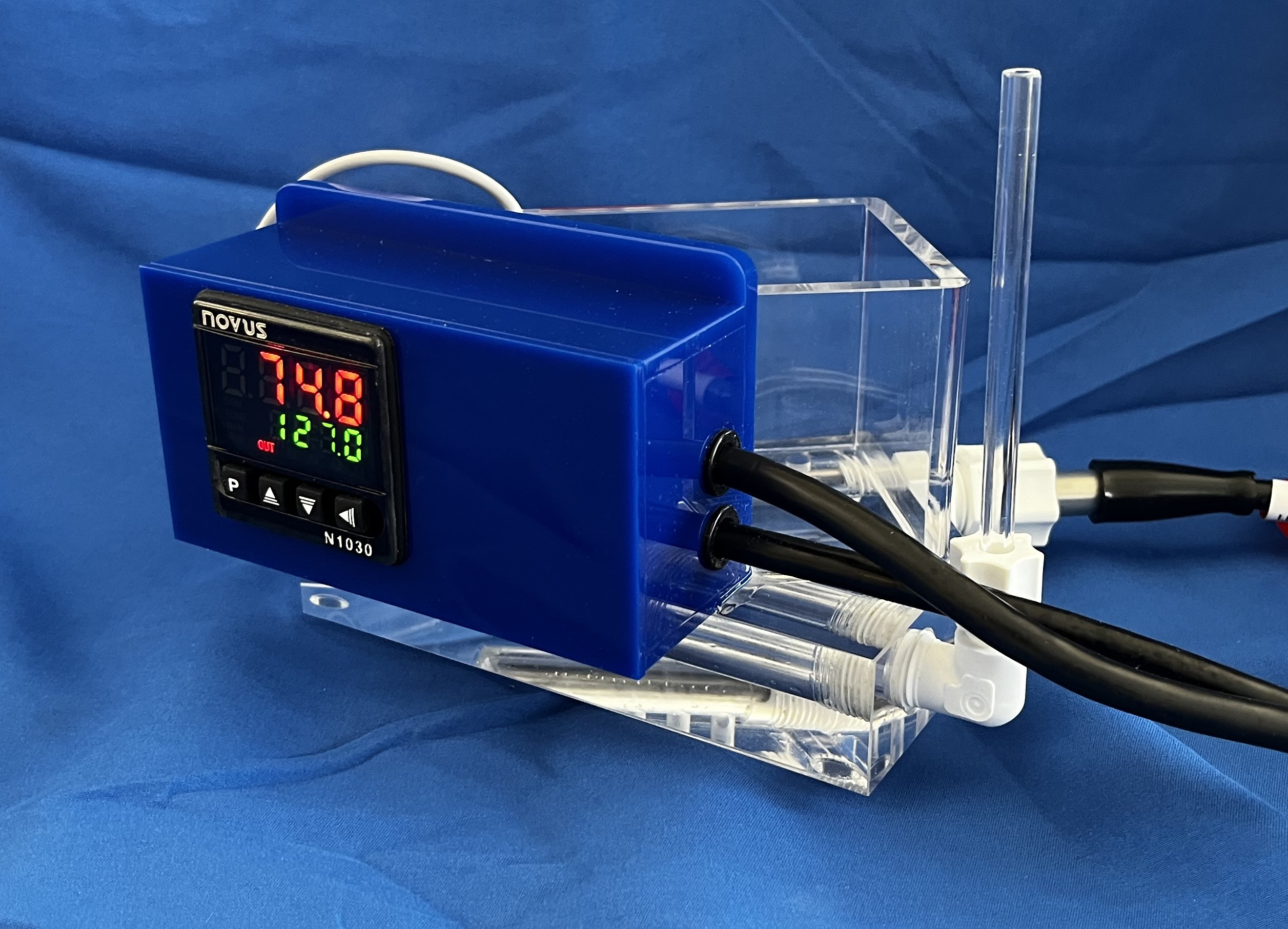 A Lucite Hull Cell, 267 ml, complete with SS teflon coated heater and digital thermostatic control and air manifold. 115V | EACH | For use with air agitated, above room temperature plating baths. | ||