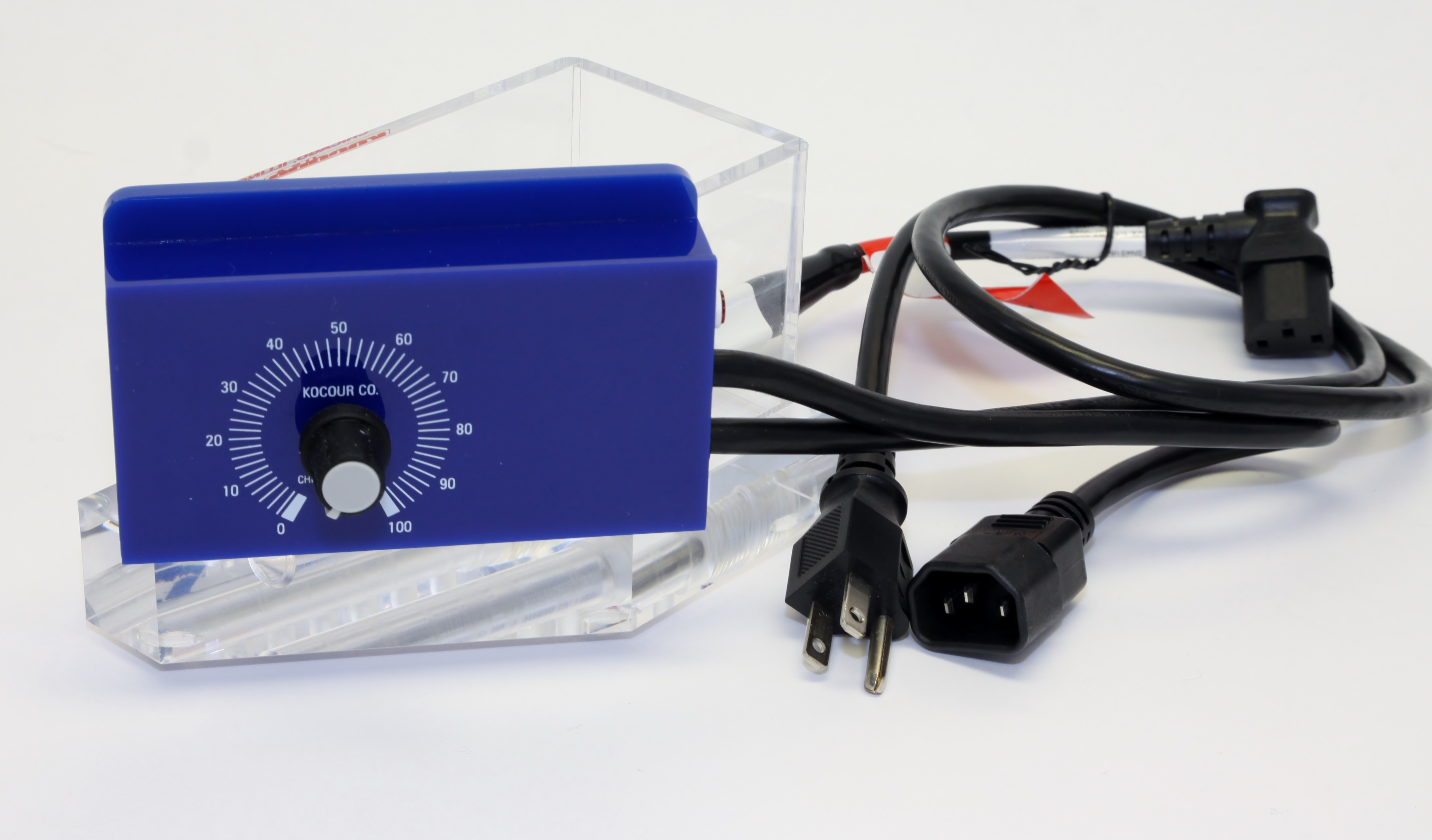 A Lucite Hull Cell complete with SS Teflon coated heater, thermostatic control and 1” stir bar. 115V | EACH | For use with eductor or non-air agitated, above room temperature plating baths. | ||